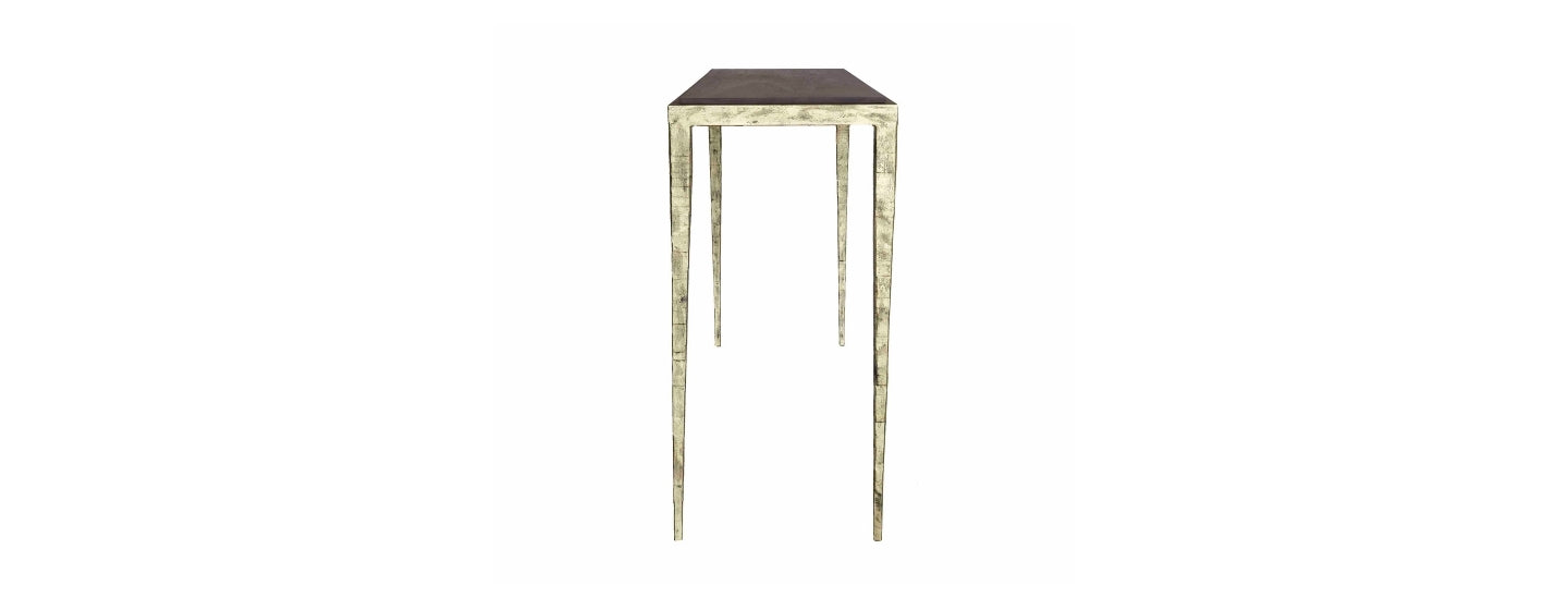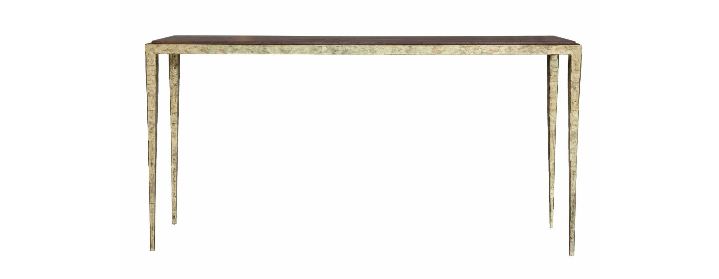 The Alon Console is available in your choice of solid wood, glass or marble top with forged metal frame